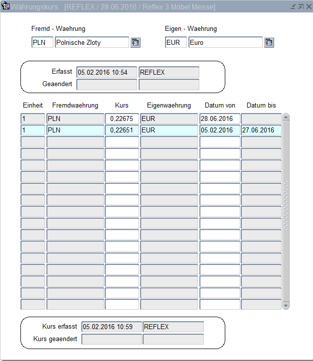 Diese Maske dient der Eingabe von aktuellen Kursen, um die Möglichkeit zu gewähren, jegliche Art von Preisen in Fremdwährung bzw. Fremdwährung in Landeswährung umzurechnen.