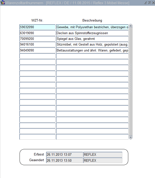 In der Auftragsposition wird die Warenzolltarifnummer gegen die Stammdaten geprüft. Stimmt die Warenzolltarifnummer nicht mit den Stammdaten im Basisartikel überein, so wird während der Positionserfassung die Werteliste geöffnet.