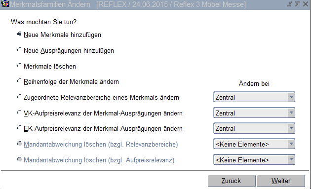 In dieser Maske wird entschieden, in welchem Bereich die Merkmalsfamilie geändert werden soll. Es besteht die Möglichkeit, Merkmale hinzuzufügen, zu löschen, deren Reihenfolge sowie deren Relevanzbereiche zu ändern. Außerdem können Ausprägungen hinzugefügt oder EK- und VK-Aufpreisrelevanzen der Merkmalsausprägungen geändert werden.