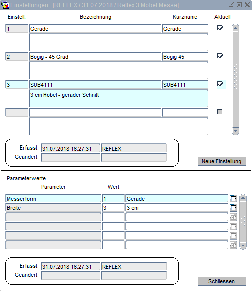 ProduktionStammdatenWerkzeuge Werkzeuge - Einstellungen Werkzeuge - Einstellungen Nachdem über den Button "Neue Einstellungen" diese gespeichert wurden, werden sie hier angezeigt. Über das Kennzeichen "Aktuell" kann eine nicht mehr benötigte Einstellung auch deaktiviert werden.
