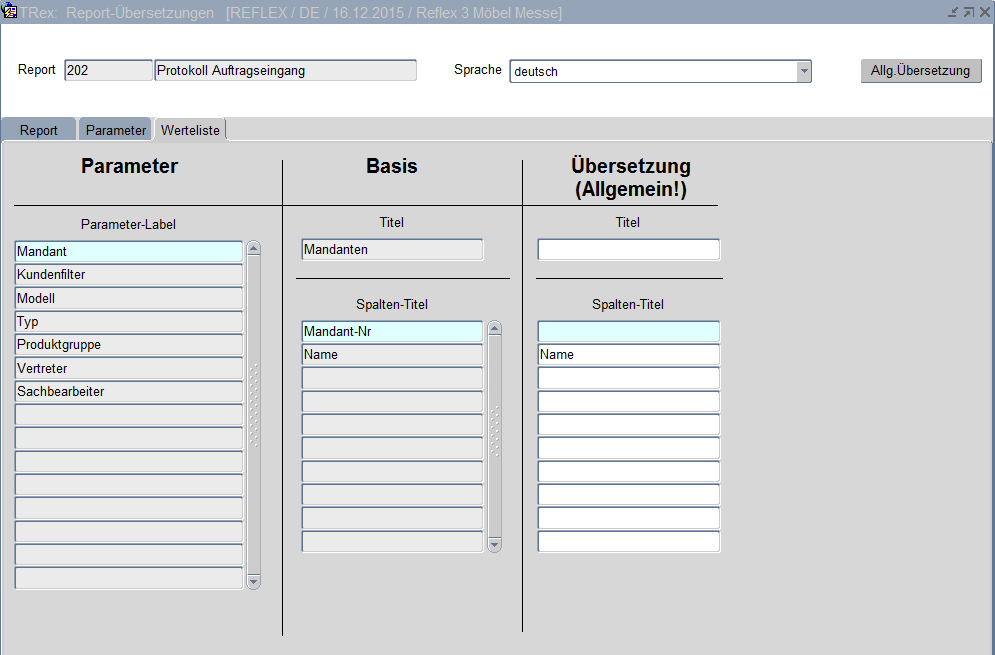 Auf dieser Registerkarte werden die Parameter angezeigt, die eine Werteliste beinhalten und die diesem Report zugeordnet wurden. Diese Übersetzungen sind nicht an den Report gebunden sondern an den Bezeichnungen der Werteliste. Die Übersetzung wird als allgemeines Formmaskenobjekt „TITLE WERTELISTE“ und „TITLE WERTELISTE SPALTE“ in dem Formmasken-Wörterbuch hinterlegt. Daher wurde zur Hervorhebung der Zusatz „(Allgemein!)“ unter der Überschrift „Übersetzung“ mit angegeben.