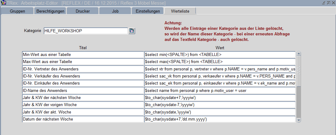 Die Registerkarte Werteliste beinhaltet das Verwalten und Erfassen von Wertelisten in den Anwendungen von TRex. Abfrage von Listen-Werten von Parametern in der Parameter-Form-Maske (Beispiel: Select titel, wert from trex_werteliste where kategorie = EMAIL)