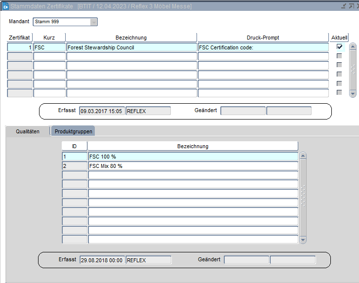 In Reflex3 ist eine Verwaltung von Zertifizierungen pro Mandant - Lieferant und Basisartikel/Realartikel möglich. Ebenfalls besteht die Möglichkeit die FSC-Zertifizierung nur für bestimmte Kunden auszuweisen.