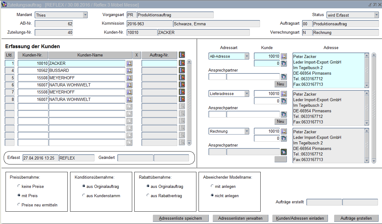 Nach Anzeige der Auftragsdaten können nun Kundenadressen gewählt oder anhand des Buttons "Kunden/Adressen einladen" gezogen werden. Die Radiobutton im unteren Bildschirmbereich "Preisübername, Konditionsübernahme und Rabattübernahme" müssen gesetzt werden - danach können die Aufträge mit dem Button "Aufträge erstellen" erfasst werden. Das System wechselt automatisch in die Auftragserfassung mit Ansicht des ersten erzeugten Auftrages. Die neu erstellten Aufträge besitzen den Status "AB wird erfasst". Hier können noch Änderungen vorgenommen werden - die Aufträge müssen über den Button "Auftrag prüfen" noch abgeschlossen werden.