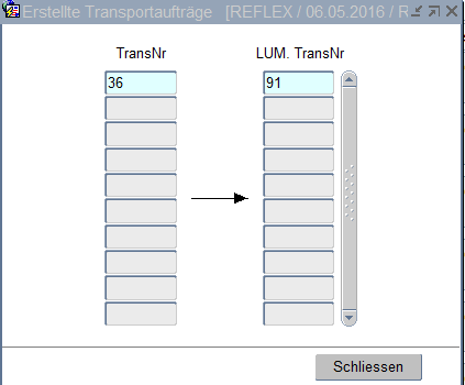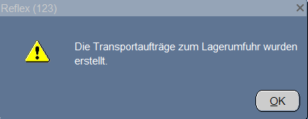 Übernimmt die Zwischenadresse und erstellt einen Transportauftrag für die Lagerumfuhr. Die neue LUM (für Lagerumfuhr) -TransNr. sowie eine Meldung des Systems erscheinen am Bildschirm. Mit den Tasten OK und Schließen werden die Fenster geschlossen.