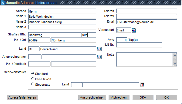 Handelt es ich bei der Lieferadresse um eine manuelle Adresse – d. h. eine Adresse, die einmalig bei diesem Kunden vorkommt und sie darum nicht als Kundenstammadresse gespeichert wird – so kann diese nach Betätigen des Schalters „manuelle Adresse" in der Maske Auftragserfassung Adressen und Konditionen an dieser Stelle hinterlegt werden.
